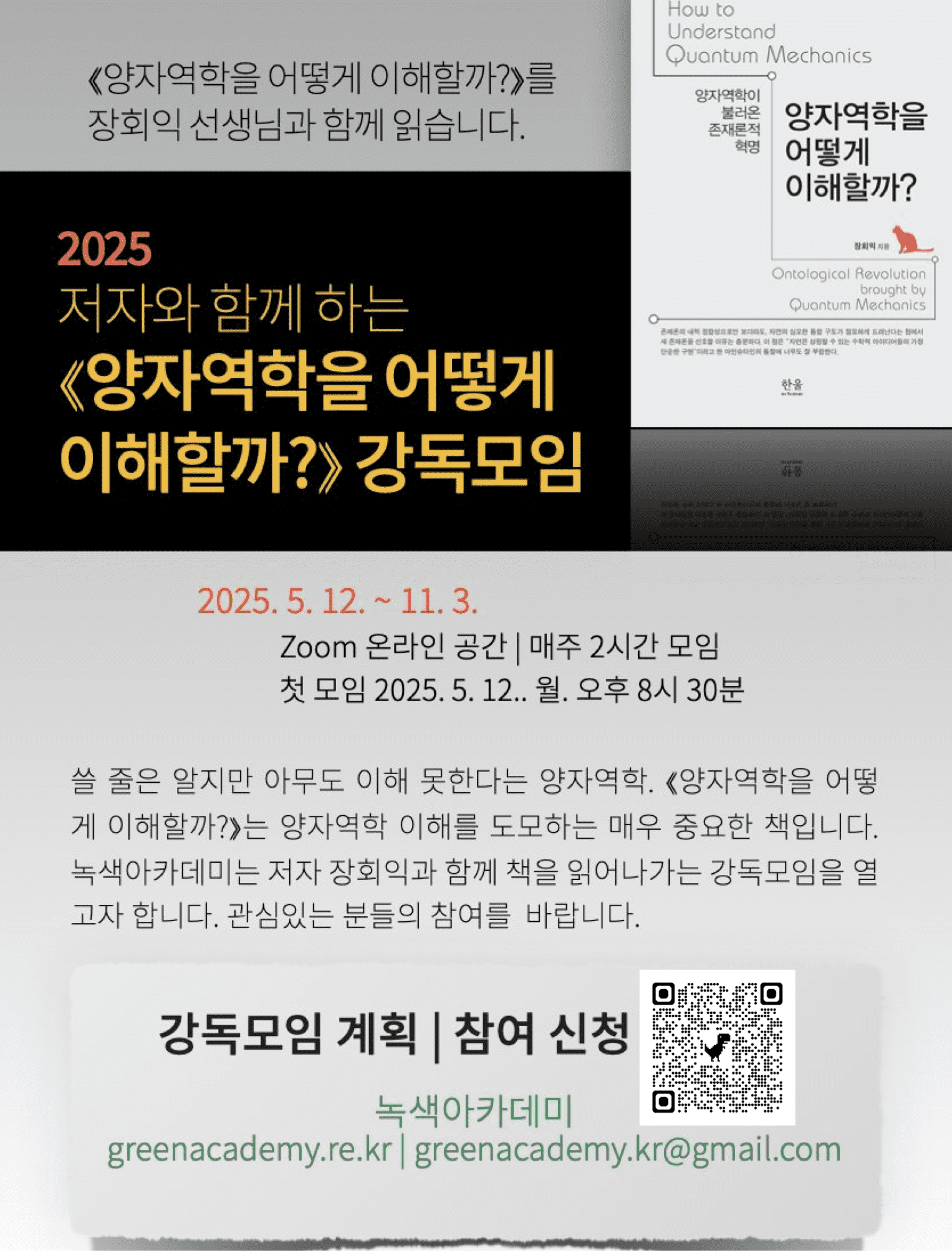 녹색아카데미는 장회익의 자연철학을 공부하는 1년 과정의 온라인 공부모임을 하고 있습니다. 장회익 선생님의 후기 저작 『장회익의 자연철학 강의』에 이어 5월 12일부터 『양자역학을 어떻게 이해할까?』를 저자와 함께 읽고 토론하고 있습니다. 자세한 안내는 안내글 링크를 참조해주세요.